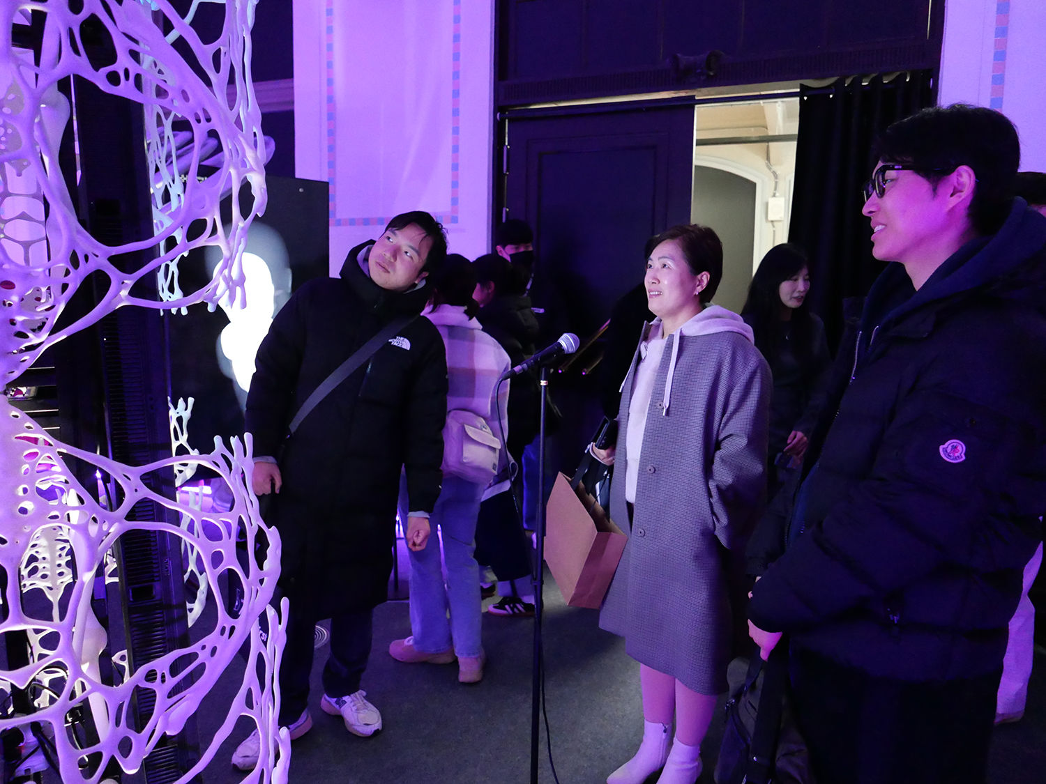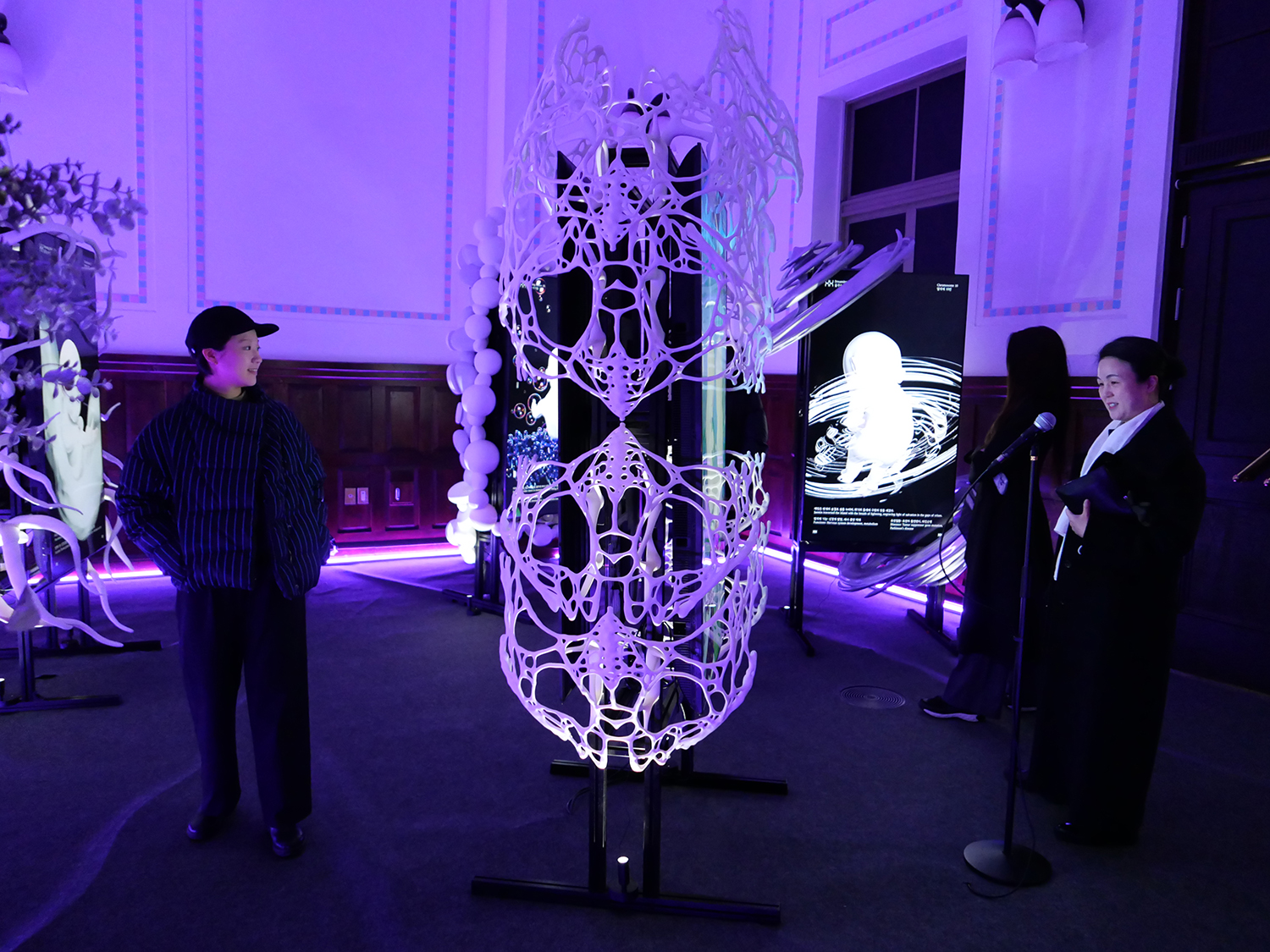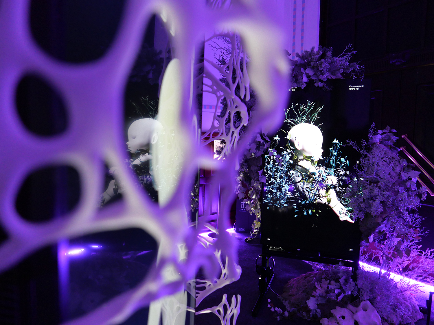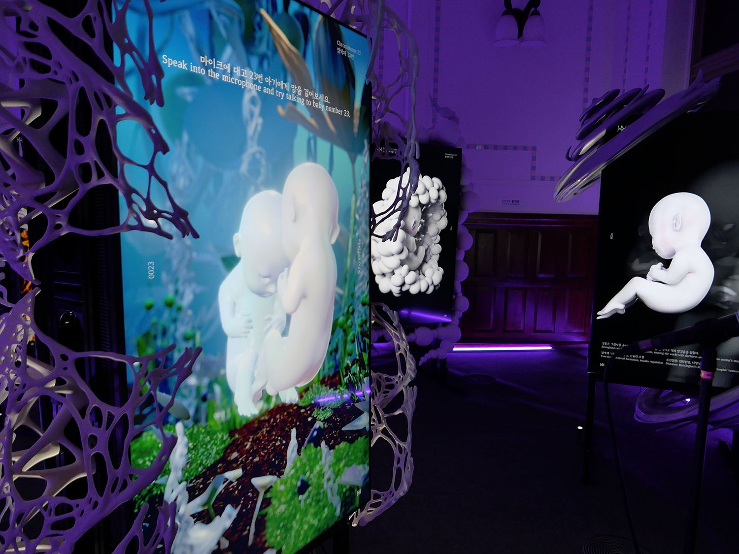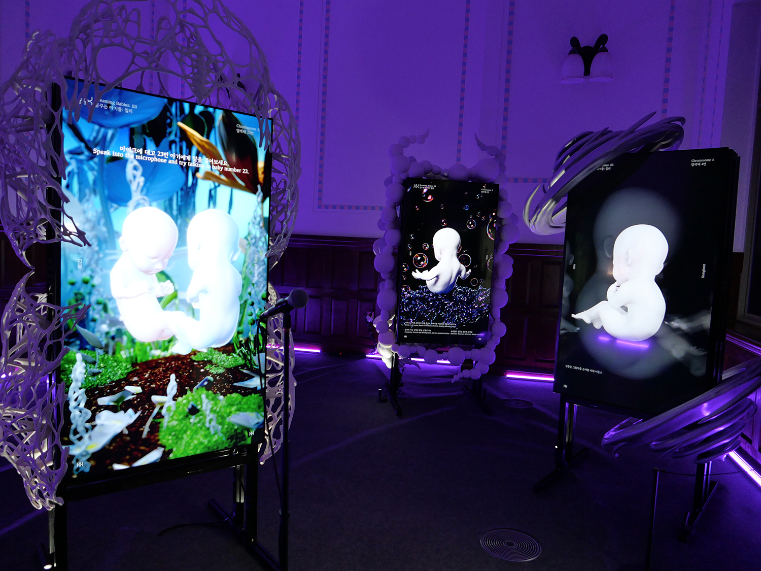 작품 “꿈꾸는 아기들: 일리”에는, 23개의 각각 다른 염색체 이상을 가진 특별한 하이브리드 인간 아기들이 각자 우주 속 가상의 인큐베이터 안에서 잠자면서 꿈을 꾸며 자신만의 고유함으로 이야기를 만들어가고 있다. 본 프로젝트는 새로운 사변적 인간 디자인을 탐구해 봄으로서 유전자 기술을 활용하여 완벽한 인간을 만들어내고자 하는 인간의 욕심과 기술 결합과 복제 기술을 통한 미래 인간 탄생에 대한 많은 가능성과 불안정성, 그리고 인간 유전자 수정 방법과 그의 윤리적 문제에 대한 담론을 담고 있다. 유전자 데이터를 기반으로 만들어진 각각의 아기의 이야기는 인공지능과의 협업으로 만들어졌고, 관람객은 실시간으로 마이크에 소리를 입력하여 ChatGPT시스템을 통해 잠자는 아기와 소통해볼 수 있다. 우주에서 부유하는 아기의 영상은 각 스크린에서 감상해볼 수 있으며, 유전자 이상이 신체의 어려움으로서가 아닌 오히려 더 특별한 모습을 지닌 인간의 모습이라는 점을 각각의 영상에서 관찰해볼 수 있다.